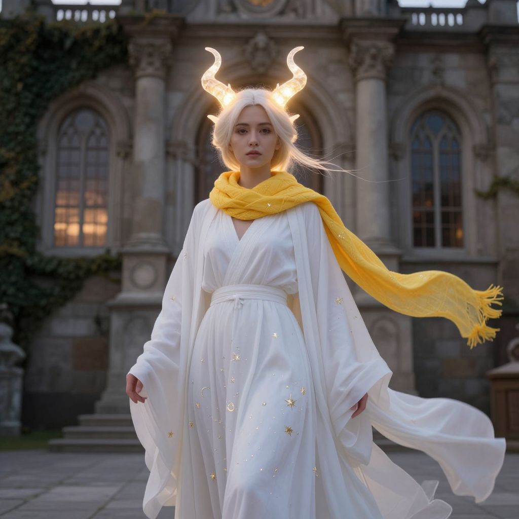 A woman with elegant, delicate horns on her head, glowing softly with a faint golden light, stands in front of a grand, ancient stone building with arched windows and ivy-covered walls. She wears a flowing white robe that drapes gracefully around her, adorned with subtle patterns of stars and crescents, and a vibrant yellow scarf woven around her neck, fluttering gently in the breeze. Her eyes are calm and wise, reflecting both mystery and strength. The scene is set in a mystical, twilight atmosphere with soft golden hour lighting, creating a sense of magic and otherworldly beauty.