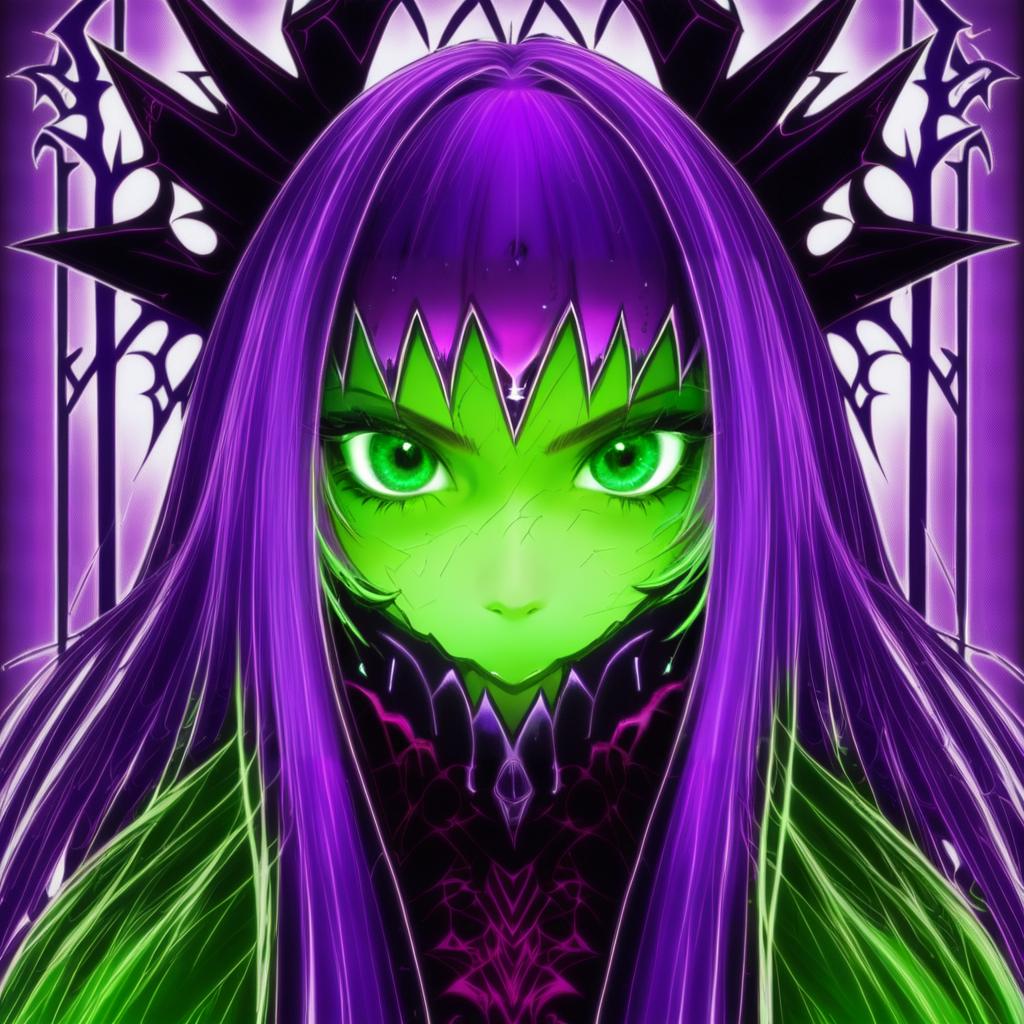 Digital anime-style artwork featuring a girl with vibrant green eyes and long purple hair. The character has a mysterious and otherworldly appearance with green skin and intricate dark purple and green clothing. A sharp black spiked crown or accessory is visible behind her head, adding to the fantasy theme. The art is influenced by styles similar to those of artist Urushihara Satoshi, emphasizing strong color contrasts and detailed facial features.
