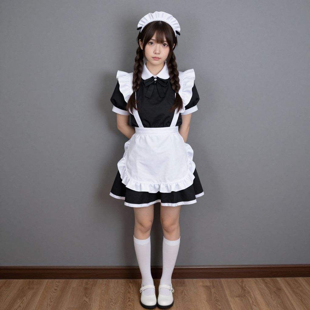 Kuromi maid costume, maid, solo, 1girl, maid headdress, brown hair, apron, twin braids, realistic, braid, brown eyes, standing, maid apron, full body, socks