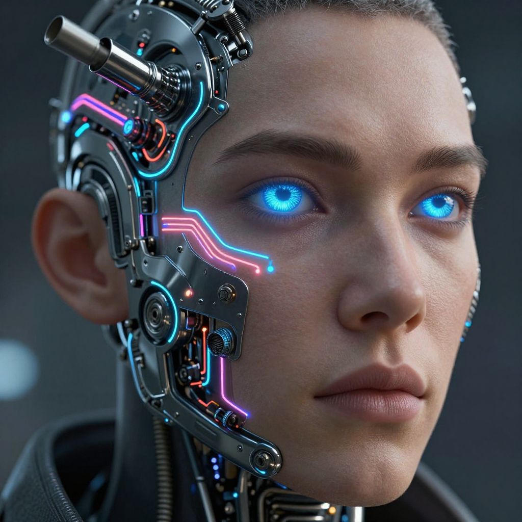 Reactor face model, a futuristic human face integrated with mechanical reactor core components, glowing neon circuits and steam vents, cybernetic eyes emitting blue light, metallic textures blending with human skin, detailed close-up, sci-fi environment