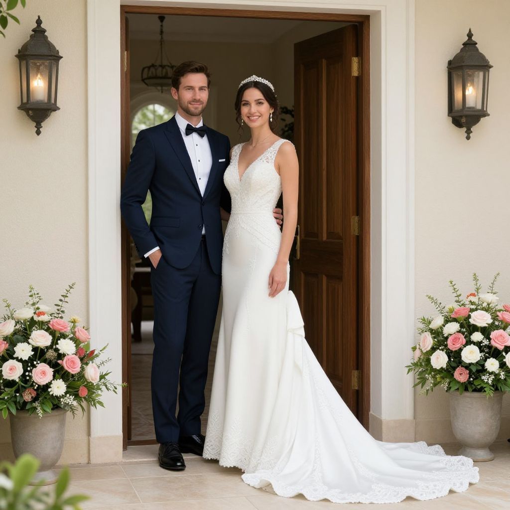 Photograph of smiling bride in white lace gown and groom in black tuxedo standing in doorway, flanked by flower pots.
