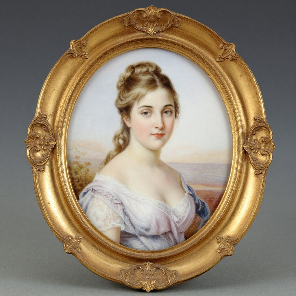 Photograph of a classical-style portrait painting in an ornate gold oval frame, depicting a young woman with fair skin, blonde hair in a bun,