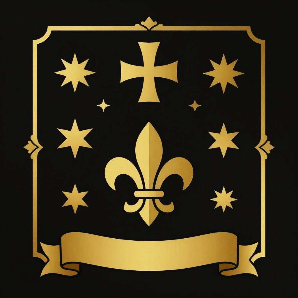 Minimalist medieval code of arms template focusing on clean lines and bold symbols including a cross, fleur-de-lis, and stars, balanced with subtle ornamental borders and a scroll beneath for text, designed with a classic black and gold color scheme.