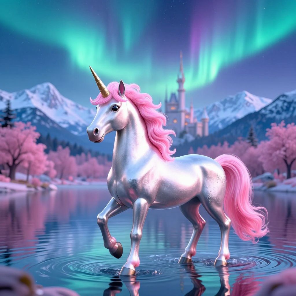 A vibrant and fantastical image of a metallic unicorn with flowing pink mane standing in a serene lake. The scene is set against a backdrop of a magical castle, snow-capped mountains and glowing aurora borealis lighting up the night sky. Pink trees frame the reflective water, enhancing the dreamlike atmosphere.