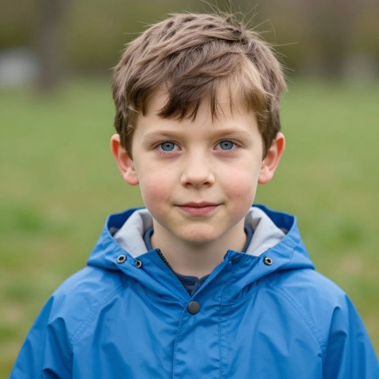 Boy with short brown hair, wearing a blue jacket with red sleeves and a red shirt with a patterned scarf around his neck.
