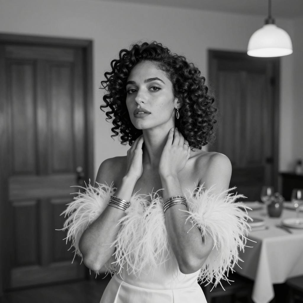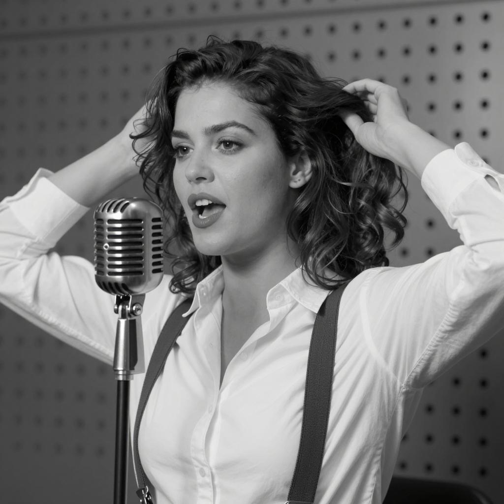 Woman with curly black hair, wearing a black sleeveless dress, holding a vintage microphone, eyes closed, mouth open in song. Red stage curtain background, man in black tuxedo with white shirt and bow tie in the left background. Piano partially visible. Bright stage lighting.