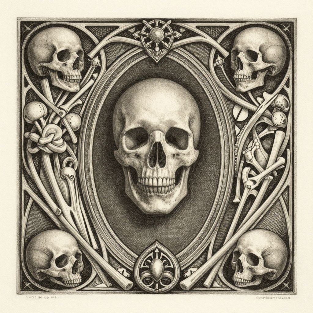 By amano and cameron gray, detailed realistic etching, memento mori, gothic ornament, skulls, bones, art nouveau, neogothic, elegant, horizontal symmetry