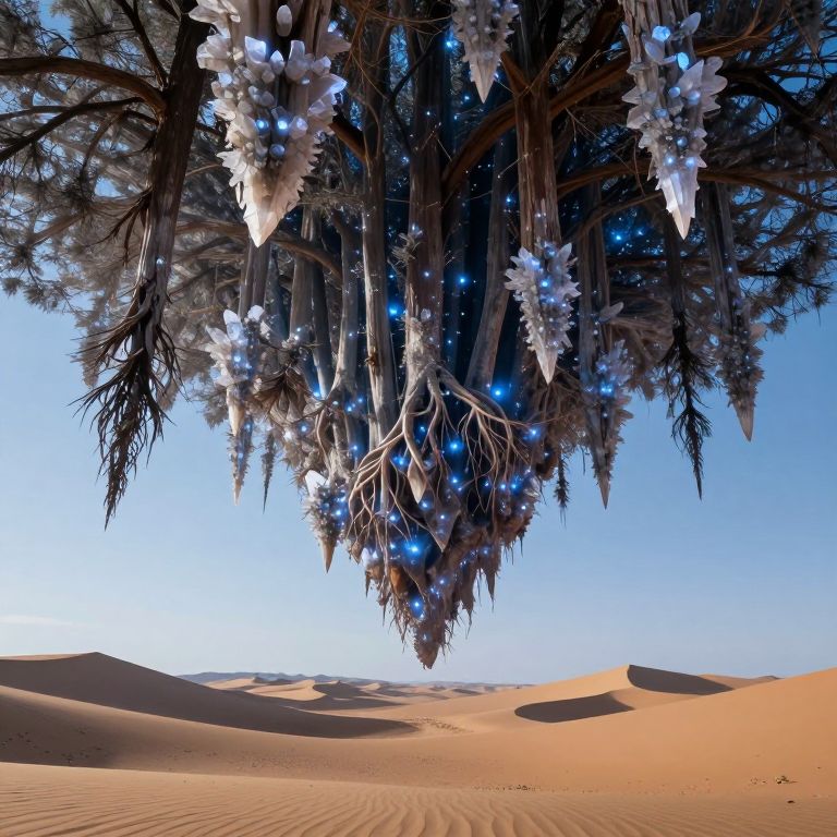 A forest of crystalline trees grows upside-down from a floating desert, their roots glowing with stolen starlight.