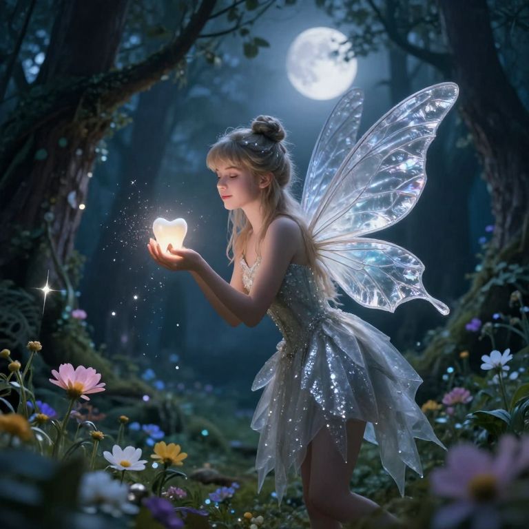 Toothfairy in a magical forest, fluttering wings shimmering with silver light, holding a tiny glowing tooth, surrounded by sparkling fairy dust and enchanting flowers under a moonlit sky, whimsical and ethereal atmosphere.