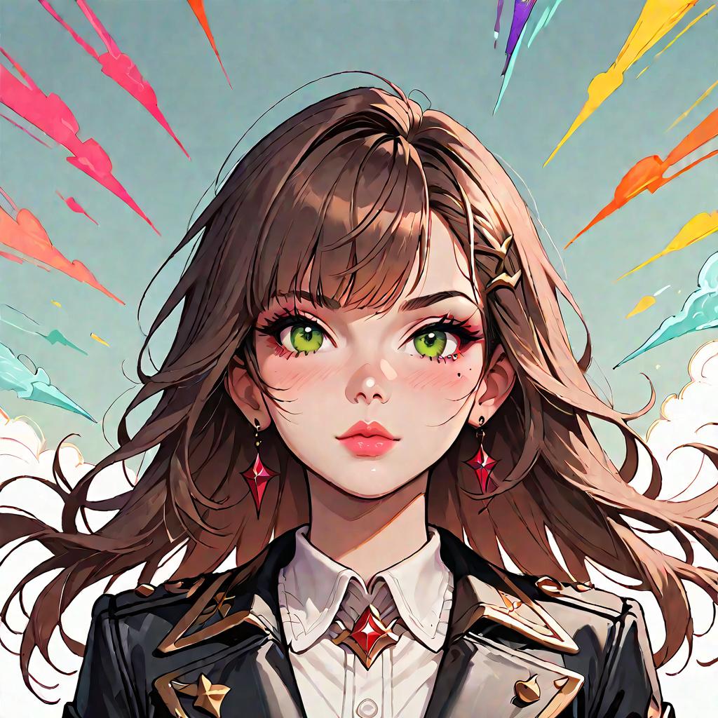 Score_9, score_8_up, score_7_up, score_6_up, score_5_up, score_4_up, solo, long hair, green eyes, looking at viewer, parted lips, jacket, brown hair, boots, shirt, bangs, floating hair, long sleeves, black jacket, red nails, virtual youtuber