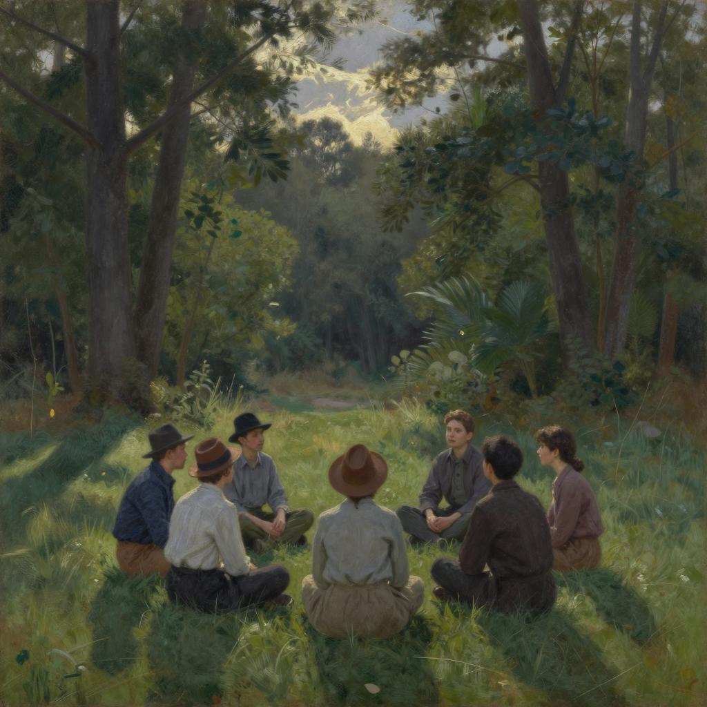 Oil on canvas painting depicting six people sitting in a circle on the grass in a forest clearing during early morning. Tall trees surround the clearing with sunlight casting long shadows. The sky is partly cloudy with soft, diffused light and rich green foliage in the background. The figures wear mid-20th century clothing and hats, evoking a serene and contemplative atmosphere.