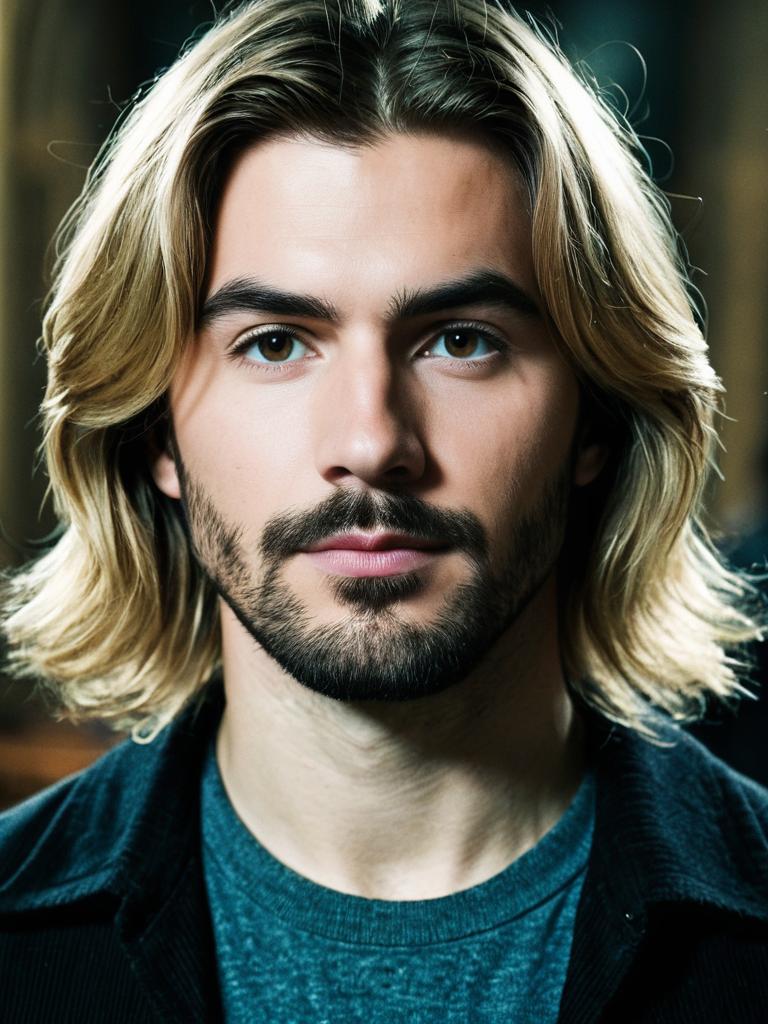 Male harry potter, 1boy, male focus, solo, beard, long hair, facial hair, blonde hair, looking at viewer, realistic, mustache, upper body, brown eyes, blurry