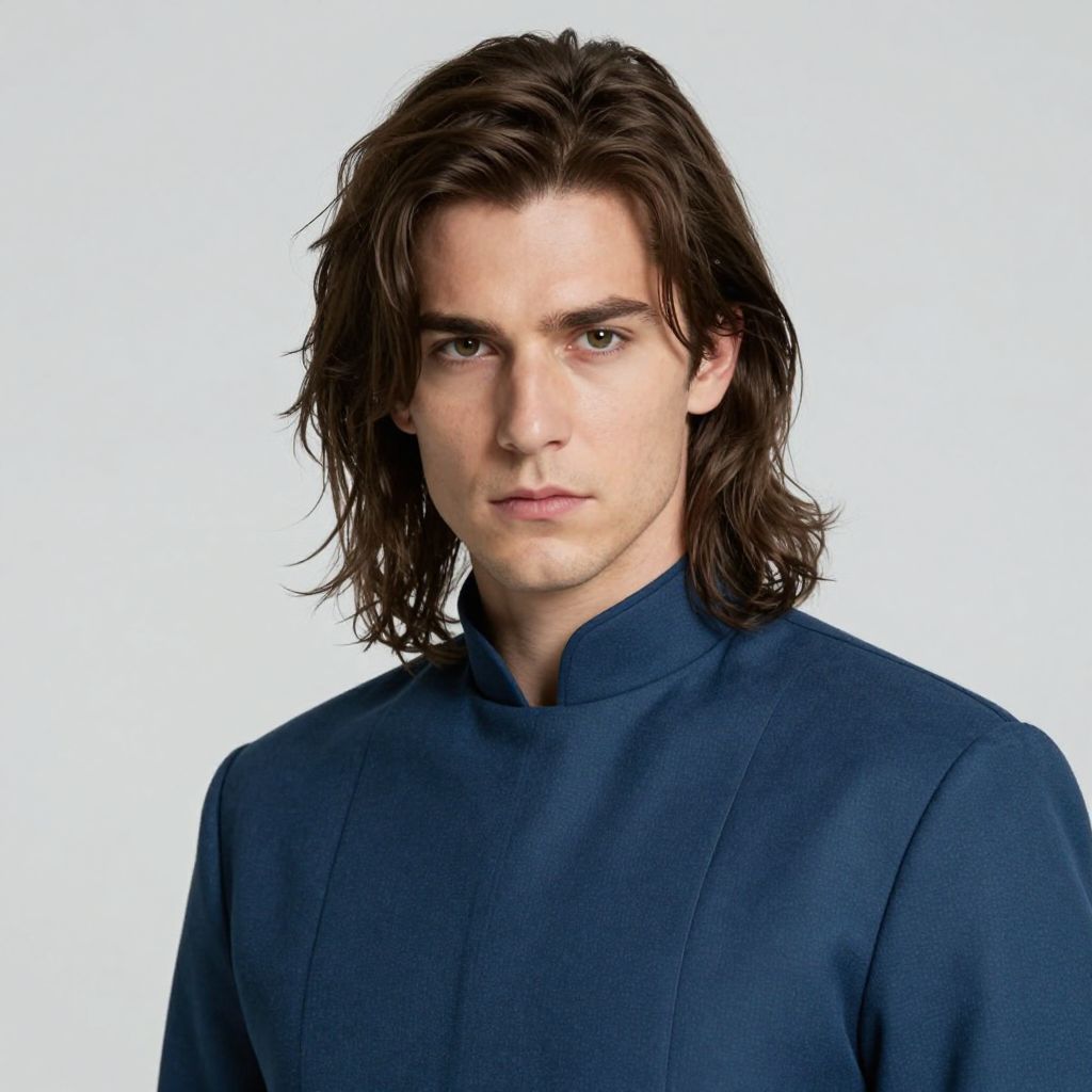 A young man with shoulder length brown hair. blue uniform. serious expression, handsome, rugged, kaladin stormblessed, way of kings, artgerm, portrait