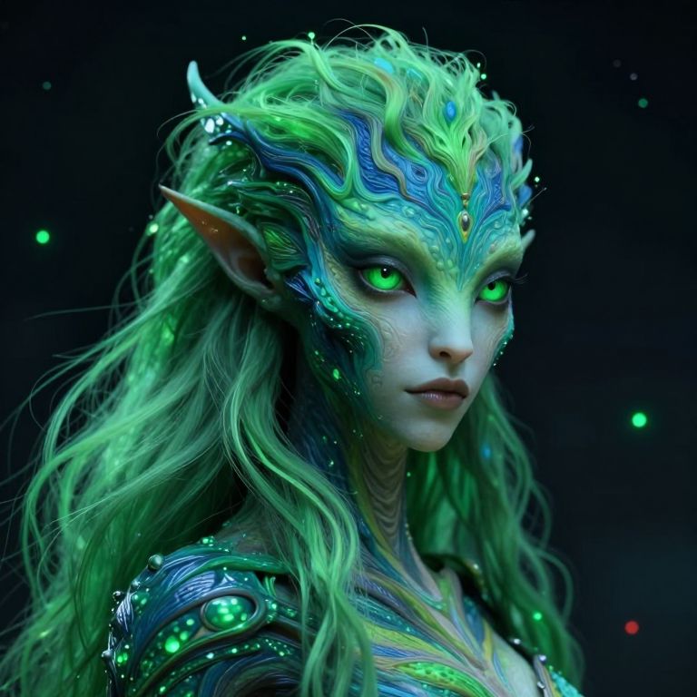 The image presents a highly detailed and realistic portrayal of a creature with a strikingly intricate and otherworldly appearance. The creature's skin is a vibrant mix of green and blue hues, adorned with intricate patterns and textures that give it a lifelike quality. Its eyes are large and expressive, with a deep green color that contrasts beautifully with the surrounding skin. The creature's hair is long and flowing, with strands that appear to be made of a glowing material, adding a sense of movement and depth to the image. The background is a dark, starry night sky, dotted with small green and red lights that seem to be floating or pulsing, creating a sense of otherworldliness and mystery. The overall composition is masterful, with the creature positioned centrally and the background elements carefully arranged to enhance the sense of depth and scale. The image is rendered with ultra-realistic shading and smooth textures, giving it a cinematic quality that is both striking and immersive.