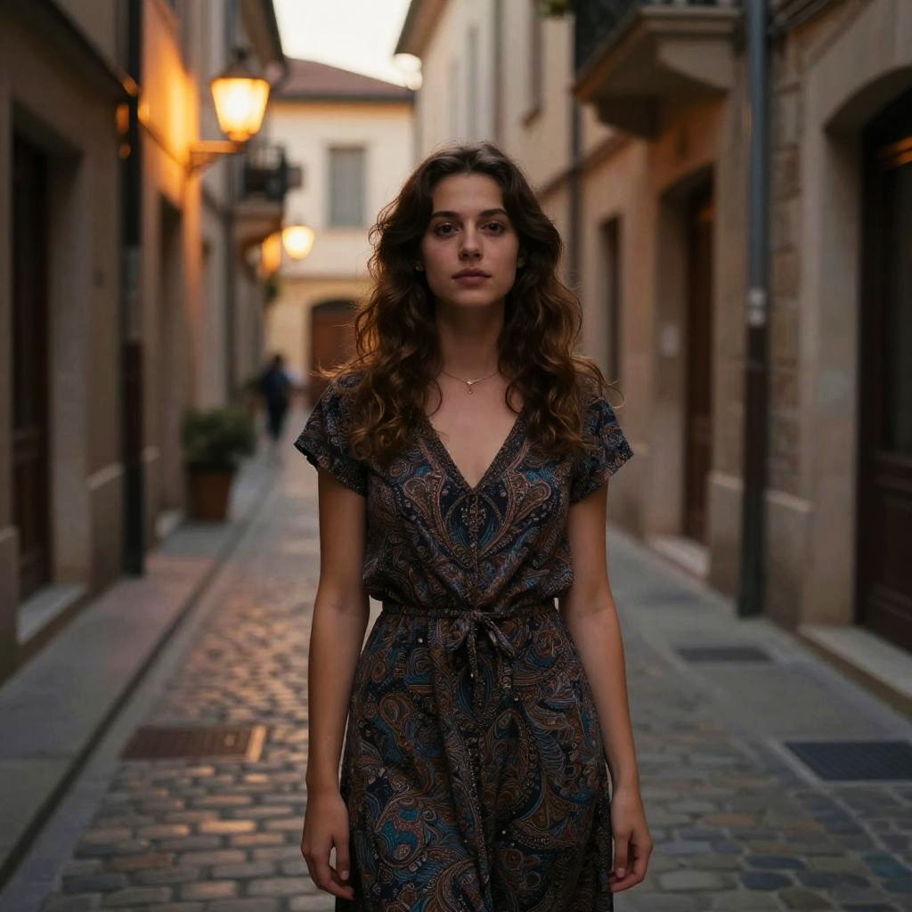 An artistic portrait of a woman standing under a canopy of string lights during the evening, creating an ambiance of charm and tranquility.