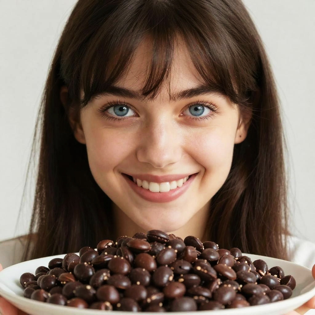 A close-up photo of a young woman with fair skin and blue eyes, smiling warmly as she leans over a plate of dark, glossy chocolate-covered beans. She has straight, dark brown hair with bangs, and her face is centered in the frame, slightly tilted towards the camera. The background is a plain, light gray, making her and the plate of beans the main focus.