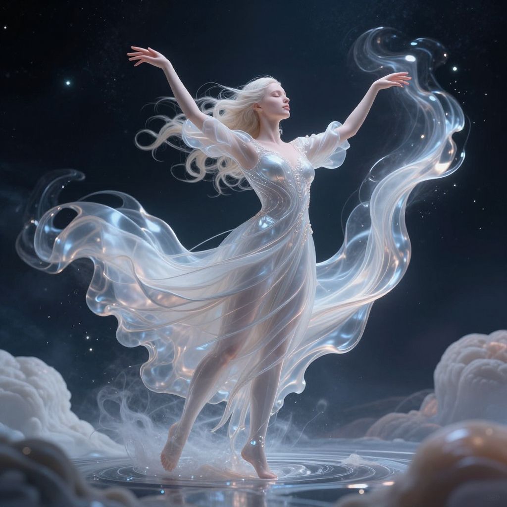 Hyperrealistic art Transmutative Essence: Graceful Dissolution, Liquid Transition, ((The transformative essence gracefully transitions from airy to liquid, its polished form dissolving with fluid elegance:1.2)). As it undergoes this metamorphosis, it imbues the surroundings with a sense of ethereal fluidity, blurring the boundaries between states of being. This graceful dissolution captures the essence of a transcendent transformation, where solidity gives way to fluidity in a seamless dance of cosmic evolution. Embracing this transmutative essence, celestial beings experience a profound shift, embracing the fluidity of existence and the endless possibilities it holds. Each transition becomes a journey of discovery, guiding the evolution of the universe towards new horizons of cosmic vitality and renewal. . Extremely high-resolution details, photographic, realism pushed to extreme, fine texture, incredibly lifelike