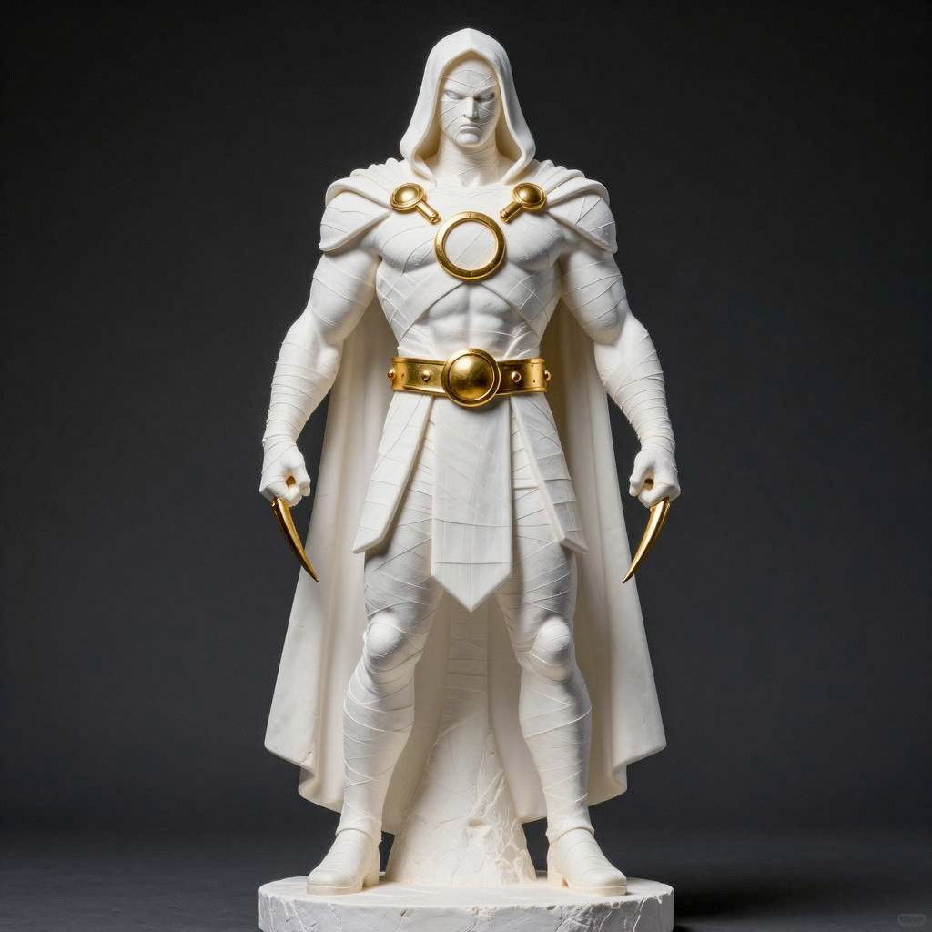 Statue of a muscular male figure with white, bandage-like armor and a hood covering his head. He has a stern expression with glowing eyes, and his face is wrapped in white cloth. He holds two sharp, golden claws in each hand. A large golden circle emblem is on his chest, and a gold belt with a round buckle is around his waist. A long white cape hangs from his shoulders. He stands on a circular stone base. The background is black. The figure has a strong, upright stance.