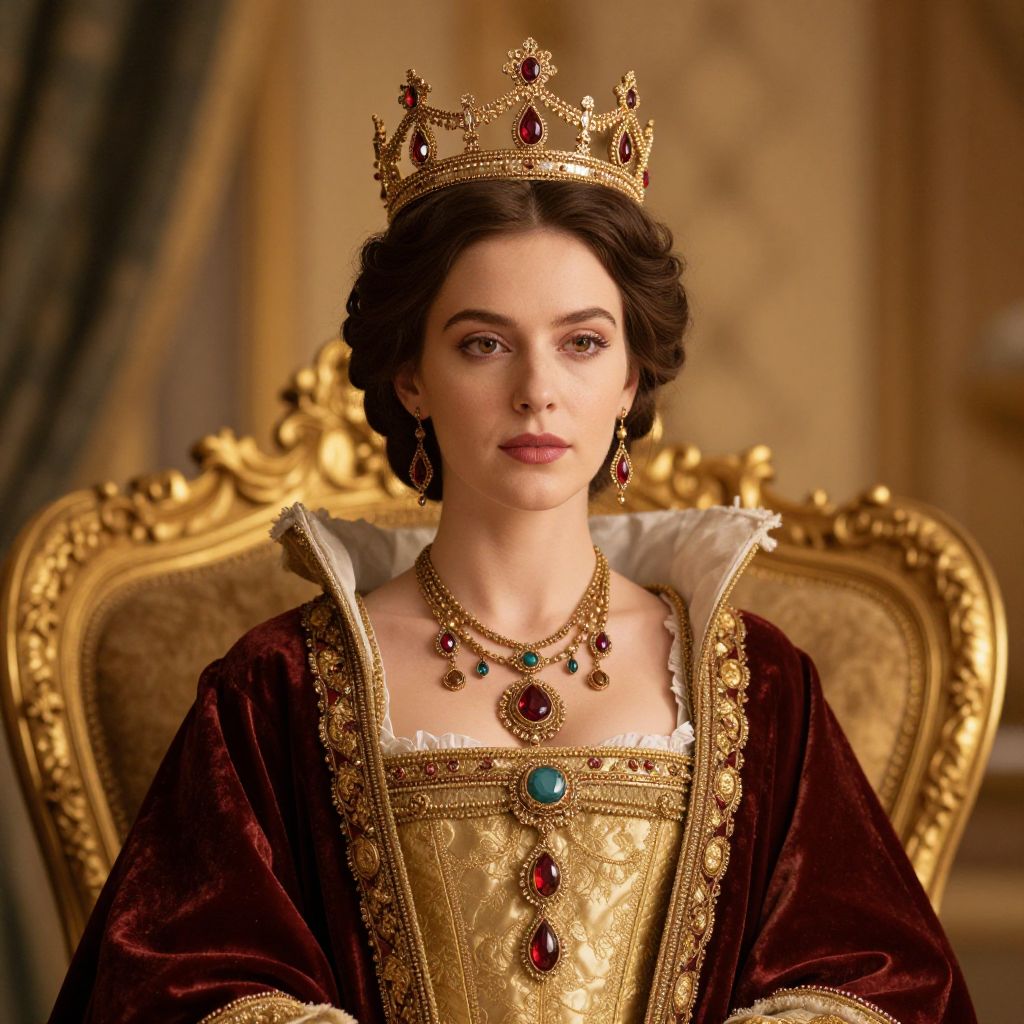 This stunning portrait features a woman adorned in an elaborate royal costume with a majestic crown and intricate jewelry. The luxurious setting and rich details reflect a historical or fantasy theme, evoking a sense of elegance and grandeur.