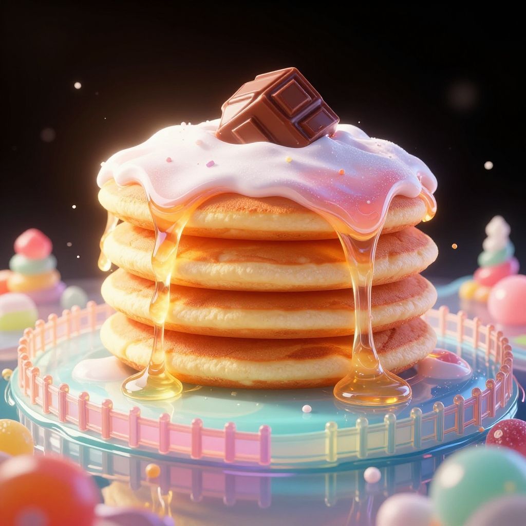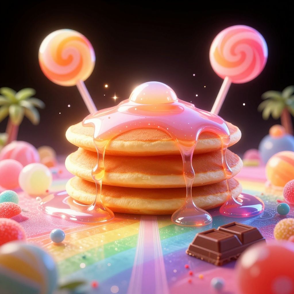 (Masterpiece), (best quality), top quality, fairytale, fantasy, sweet, candy, hyperrealistic, in the style of pixar, 3d, cg unity wallpaper, 8k, magic, color coordination, undersized sucker lollipop in background, oversized pancake, drizzle, syrup, delicious, (house made of candy:1.3), shimmer, glitter, glowing, gradient sky, particles, vanishing point, small details, see-through, transparent, colorful, chocolate bar, parfait, colored lineart, beautiful, sunlight, tropical, motio blur, rainboow terrain, volumetric lighting, multicolored theme, (gradients), atmospheric, top lighting, muted colors, soothing tones, miniature scale world, intricate details, dynamic, animated, liquid, breathtaking, magical, black background, (deep depth of field:1.3), extremely detailed background, sprinkles, 850mm, digital illustration, cl4mp, more detail XL, glass