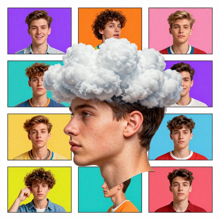 Storyboarding a boys head with clouds, in the style of colorful mindscapes, pop culture collages, color splash, rainbowcore, jarring juxtapositions, surrealistic overtones, realistic images,