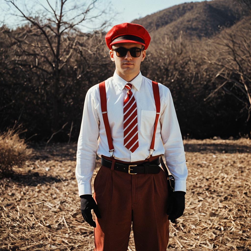 Woody halloween costume man, photo of handsome young man, wearing orange baseball cap, mustard yellow long-sleeve shirt, brown suspenders, black tie, brown trousers, white shirt collar, serious expression, standing in warmly lit room, wooden door in background, vintage style, film still, Tom Hiddleston, period costume, close-up, center frame, soft lighting