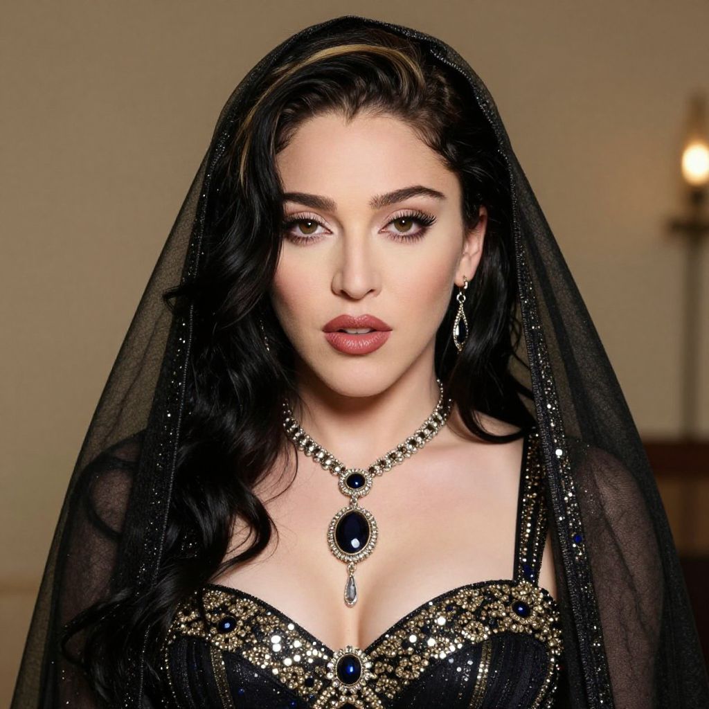 Madonna fancy dress costume, 1girl, solo, looking at viewer, veil, black hair, jewelry, necklace, upper body, realistic, dress, lips