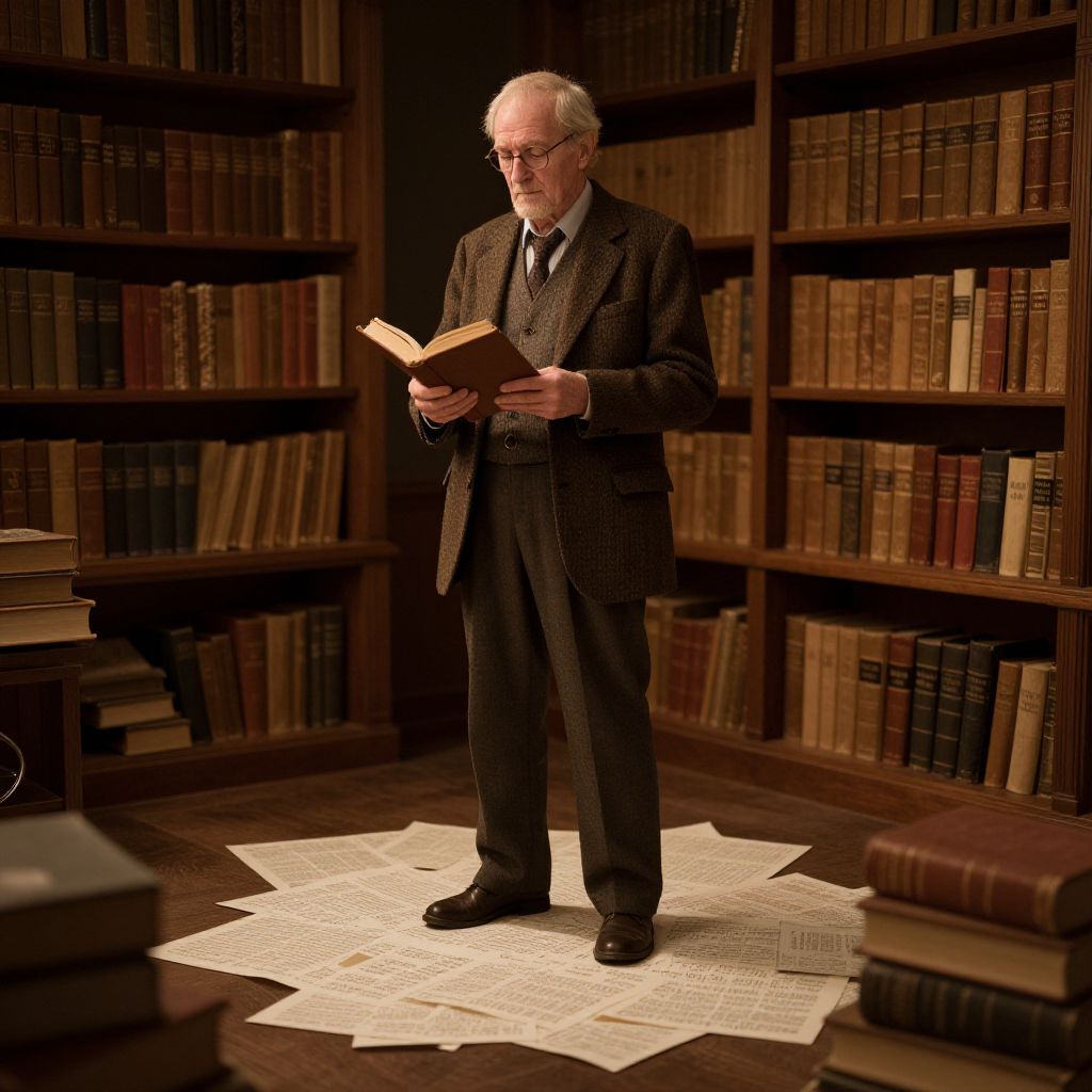 "Uv Mapping a old man standing on a letter in his library, sorrounded by books, hoolding a book in his hands::5 realistic::1 candlelight::4.7 paper::5,"