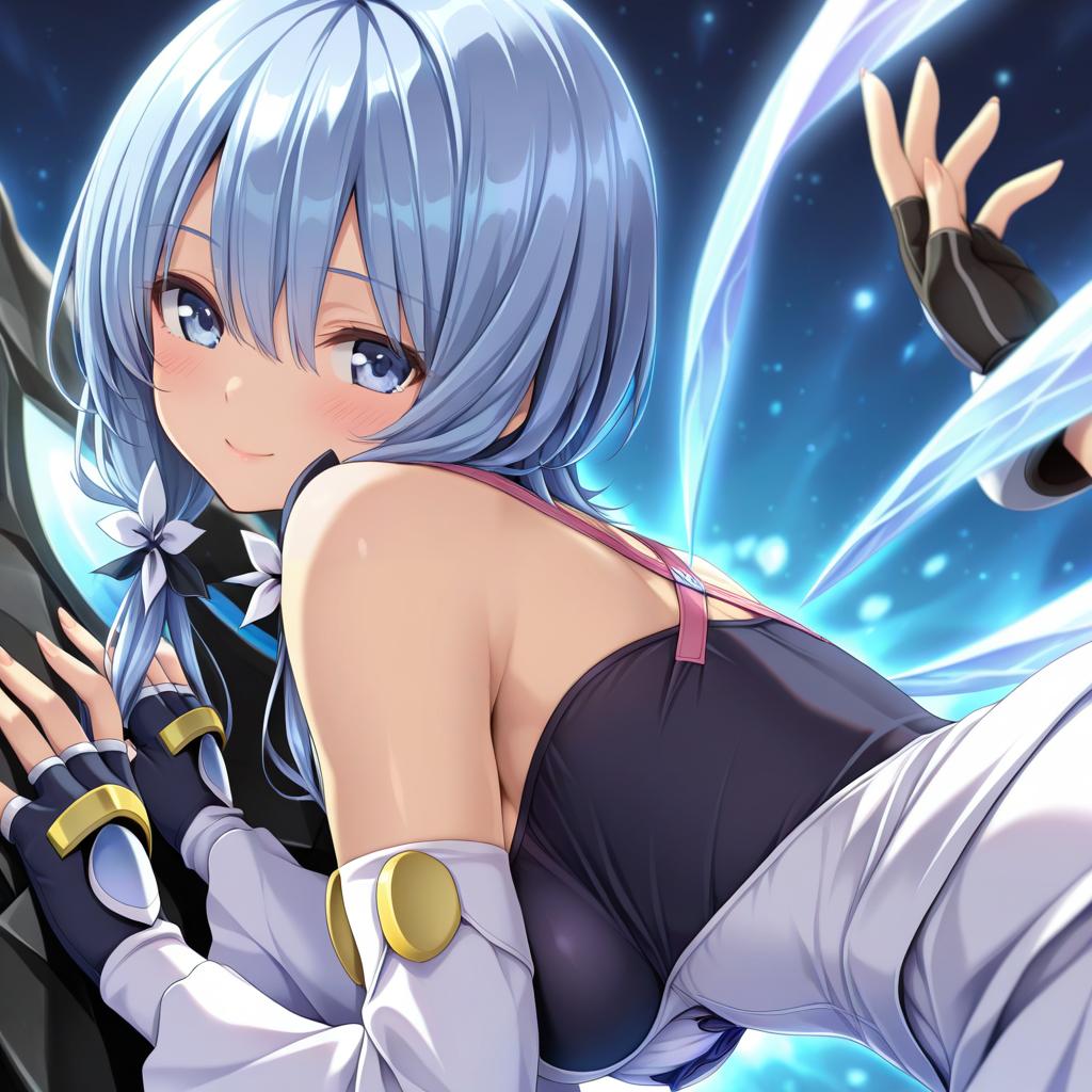 Aqua (kingdom hearts), kingdom hearts, 1girl, blue eyes, hair between eyes, blue hair, short hair, medium breasts, fingerless gloves, bare shoulders, detached sleeves, by artist koku, illustrious