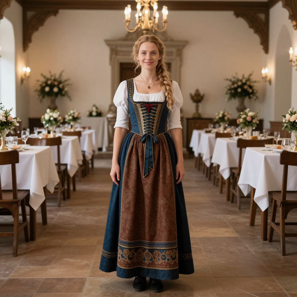 German dress party, woman in medieval dress standing in a large room with tables