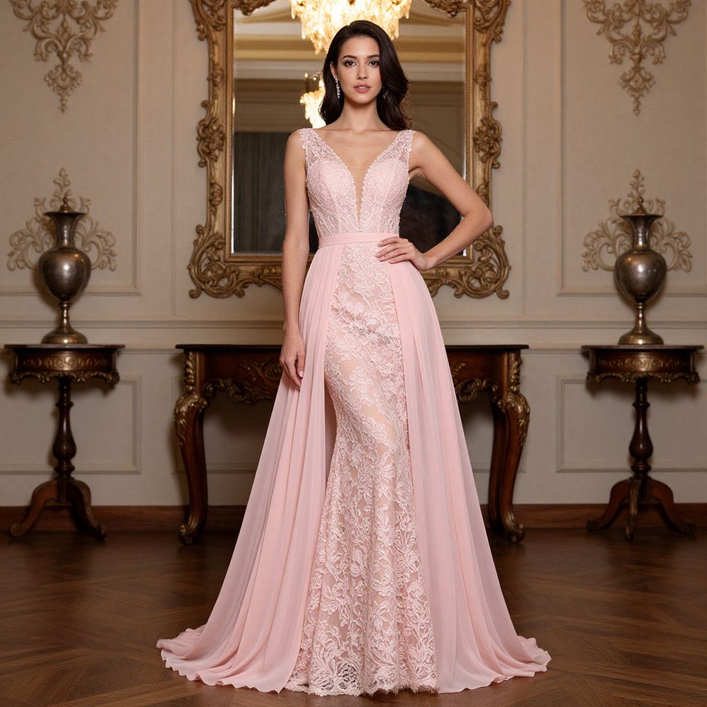 Elegant woman posing gracefully in a stunning pink lace long prom gown, featuring a sheer bodice and flowing chiffon skirt, set against the backdrop of a luxurious interior with ornate decor, including a chandelier above and two wooden side tables flanking her.