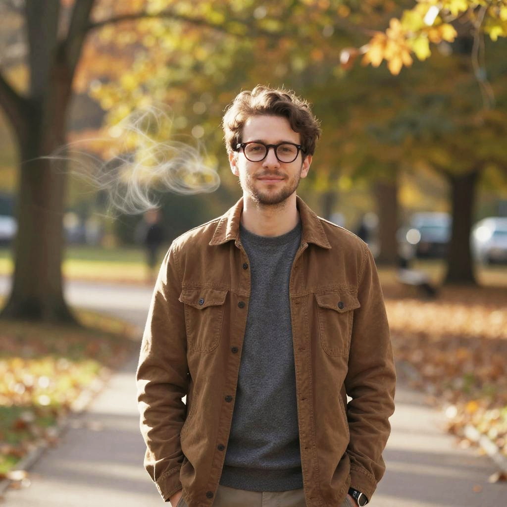 Brown guy with glasses standing in a sunlit park, surrounded by autumn foliage, gentle breeze, soft warm tones, natural environment, casual outfit, candid portrait style