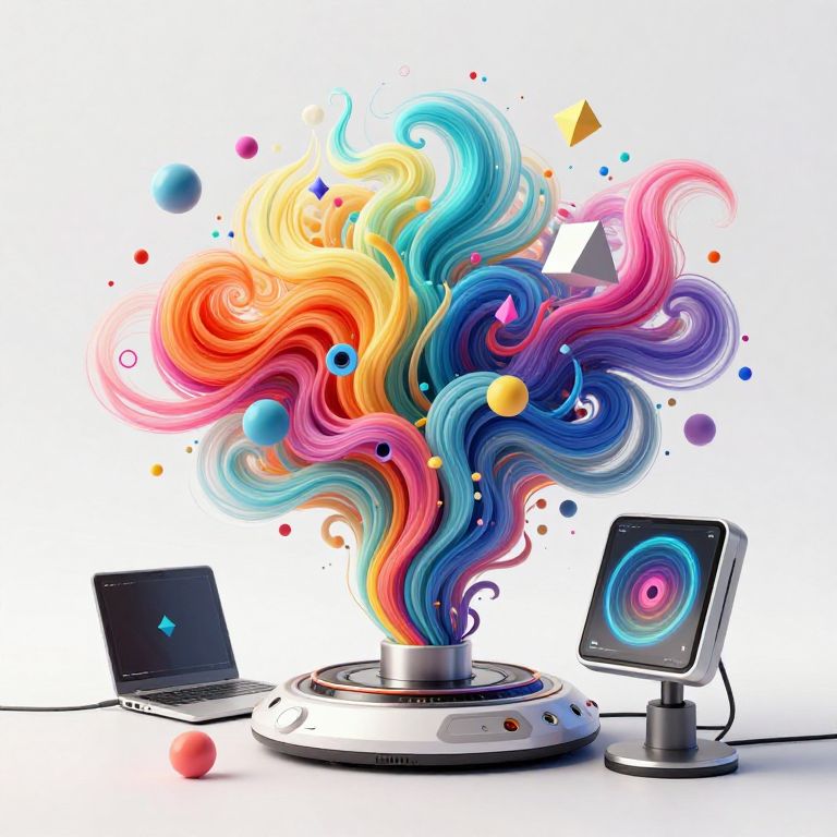 A vibrant digital artwork features a swirling, multicolored vortex emerging from a silver platter on a turntable. The vortex, composed of vivid blue, pink, yellow, and orange waves, is interspersed with floating geometric shapes and colorful spheres. Flanking the turntable are a black laptop on the left and a touchscreen monitor on the right, both displaying a blue and pink circular pattern. The white background emphasizes the bright, dynamic colors and abstract forms, creating a futuristic, psychedelic aesthetic. The image combines elements of digital art and abstract expressionism.