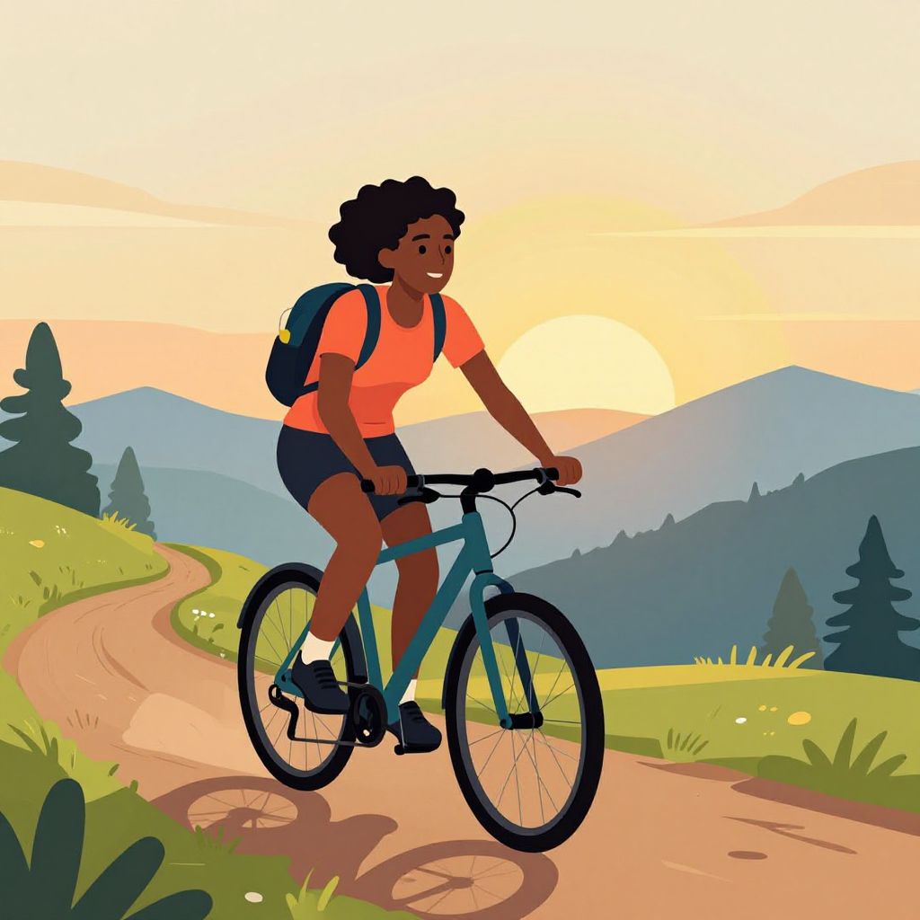 A vibrant vector illustration depicts an Afro-American woman cycling along a mountain trail during a golden-hour sunrise, showcasing a serene and dynamic outdoor adventure with bold colors and clean lines.