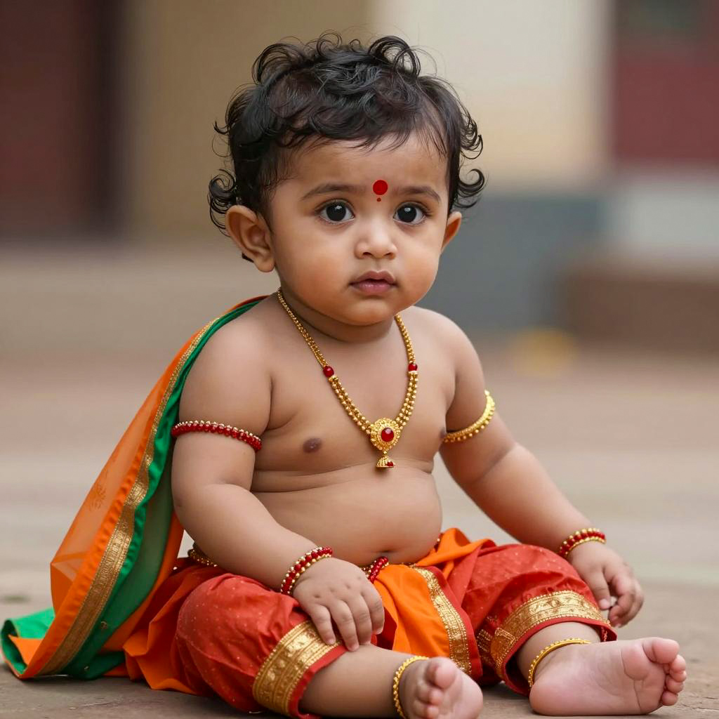 Infant indian costume, photograph of an Indian toddler, standing in front of a doorway, wearing traditional clothes, blue scarf, colorful headband, red and yellow patterned dhoti, bare chest, red necklace, brown skin, dark hair, large brown eyes, serious expression, stone archway in background, daytime, natural light, cultural attire, traditional Indian child, realistic style
