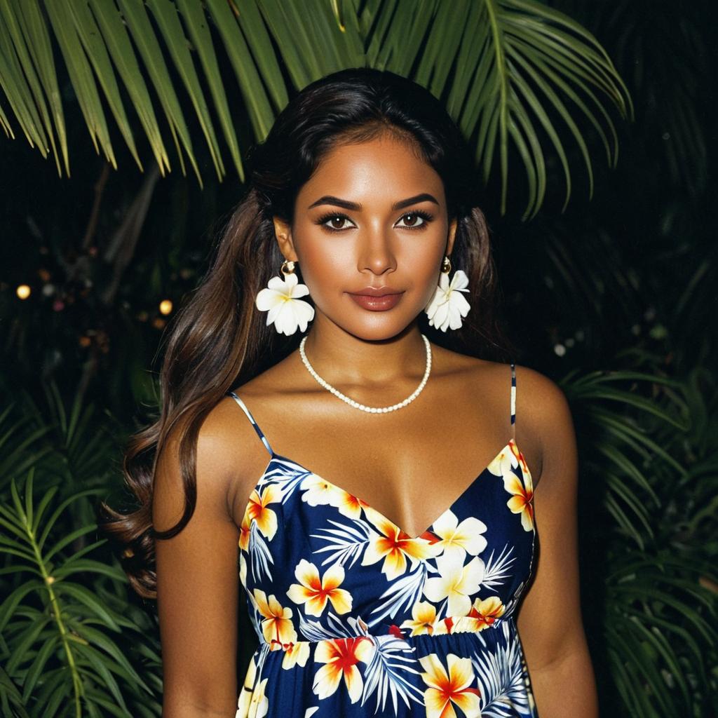 Portrait of a dark-skinned woman with long brown hair and brown eyes wearing a blue Hawaiian-style floral dress with yellow and white flowers. She accessorizes with white flower-shaped hoop earrings and a delicate pearl necklace, standing against a backdrop of tropical palm leaves at night.