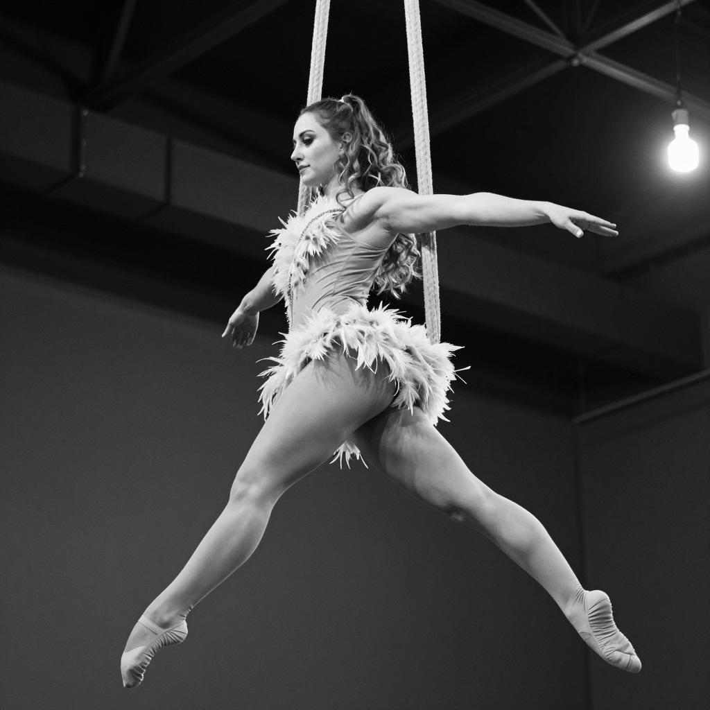 A black-and-white photograph of a female aerialist with long, wavy hair. She is suspended in mid-air by two ropes, wearing a short, feathered dress and tights. Her legs are extended, one pointing downward, the other upward. Background includes a dimly lit, industrial-looking structure with metal beams and a glowing light bulb.