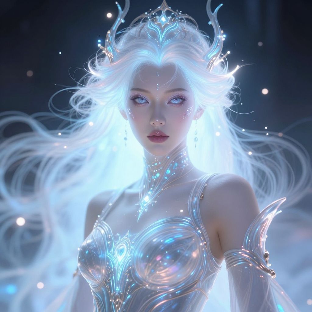 This is a digital artwork depicting a fantasy elf woman with long, dark blue hair and glowing blue eyes. She has pale skin and pointed ears, adorned with intricate, glowing blue tribal-like markings on her forehead and cheeks. Antler-like, luminescent silver horns emerge from her hair. Her lips are slightly parted, showing a calm expression. She wears a sleeveless outfit with delicate, glowing blue patterns. In the background, a circular, blue, glowing orb hovers, adding to the mystical ambiance. The overall color palette is cool blue and silver, creating a magical, ethereal atmosphere.