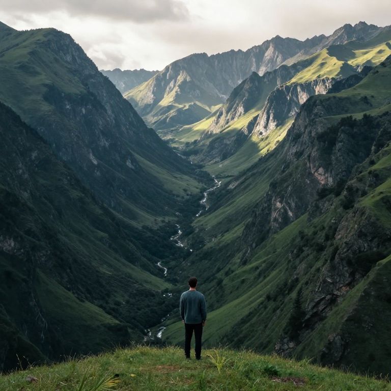 A solitary figure stands at the edge of a verdant valley, gazing into the infinite embrace of towering mountains, where the interplay of light and shadow whispers the eternal dance of solitude and awe, inviting introspection amidst nature’s boundless symphony.