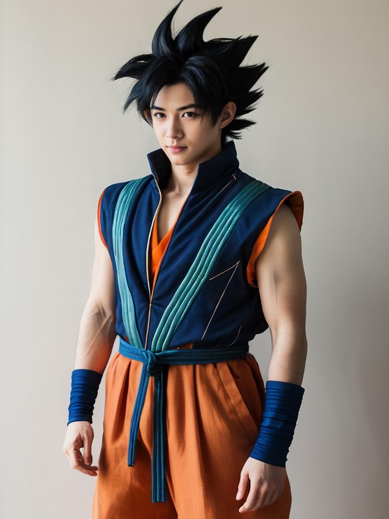 Man cosplay. Wearing Son Goku (Xeno) costume. Realistic photo. Dressed as Son Goku (Xeno) --sref 1400