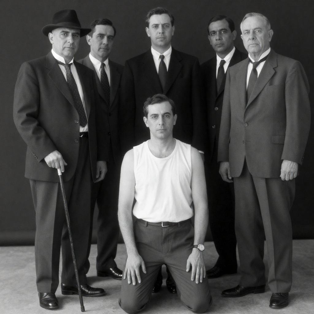 Black-and-white photograph. Six men in a group, standing and kneeling. Center man in sleeveless white shirt, kneeling. Men around him in suits, one with hat and cane. Serious facial expressions. Dark background. One man holding a cane on left.
