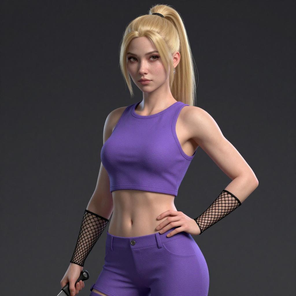 Digital artwork of a blonde woman with pale skin, wearing a sleeveless purple crop top and matching pants. She has a long ponytail, black fishnet arm sleeve, and holds a knife in her right hand. She stands confidently against a dark gradient background, with her left hand on her hip.