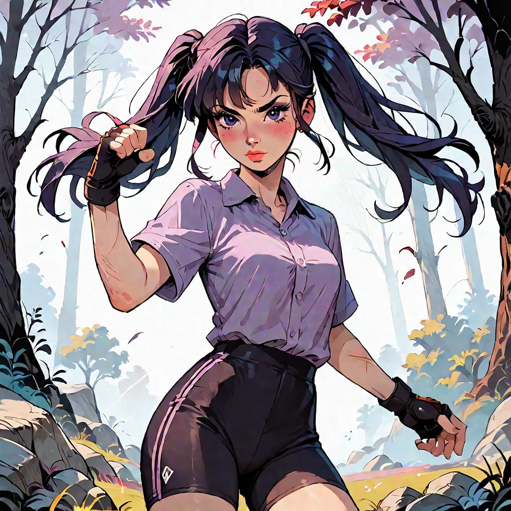 Videl, 1girl, blue eyes, shadows, pigtails, white shirt, purple shirt, masterpiece, best quality, absurdres, perfect lighting, score_9, score_8_up, score_7_up source_anime, fighting pose, fingerless gloves, bike shorts, open field, trees, rocks, looking at viewer, scratches