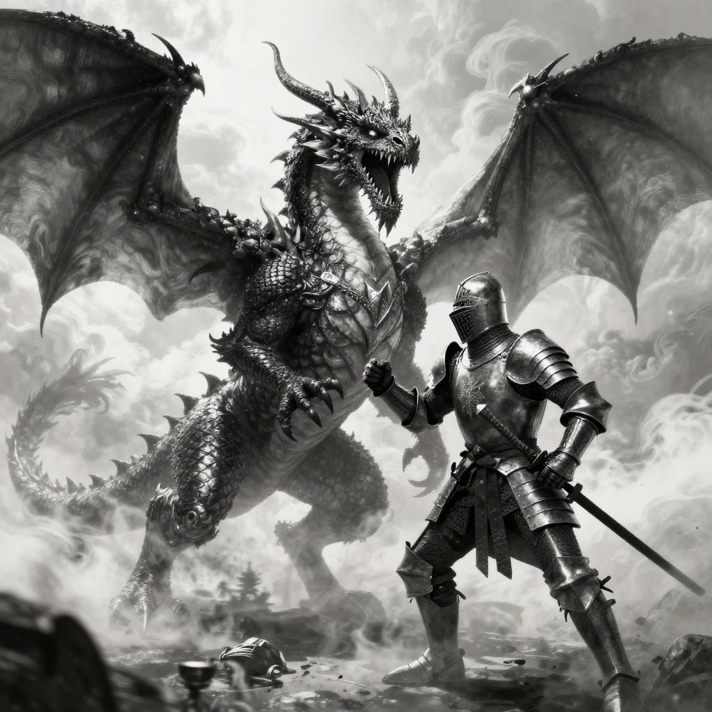 Majestic fantasy black and white dragon battling a fierce knight in dark armor amidst swirling clouds, intense expressions and detailed scales, cinematic fantasy artwork in monochrome