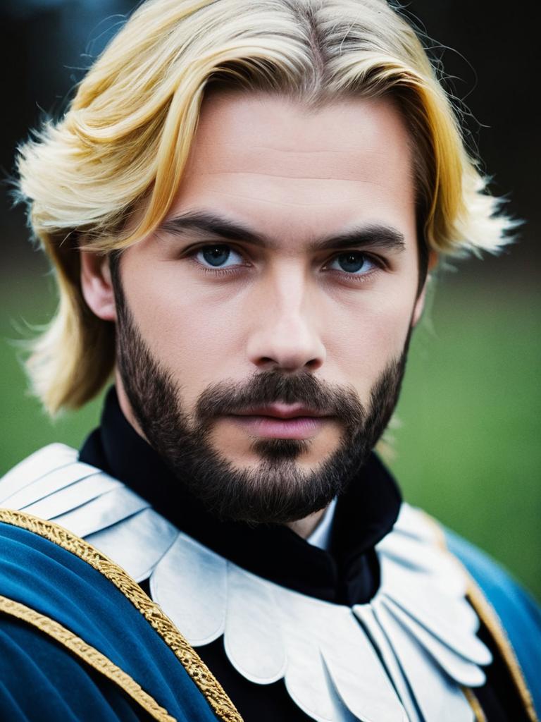 Prince cornelius costume, 1boy, male focus, facial hair, solo, beard, blue eyes, blurry, looking at viewer, blonde hair, blurry background, upper body, mustache, realistic, multicolored hair, closed mouth
