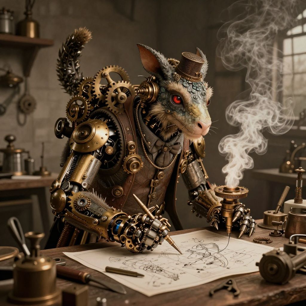 Steampunk rat with gears and clockwork arms, wearing a tiny hat, drawing on paper with a smoking pipe in dim workshop.