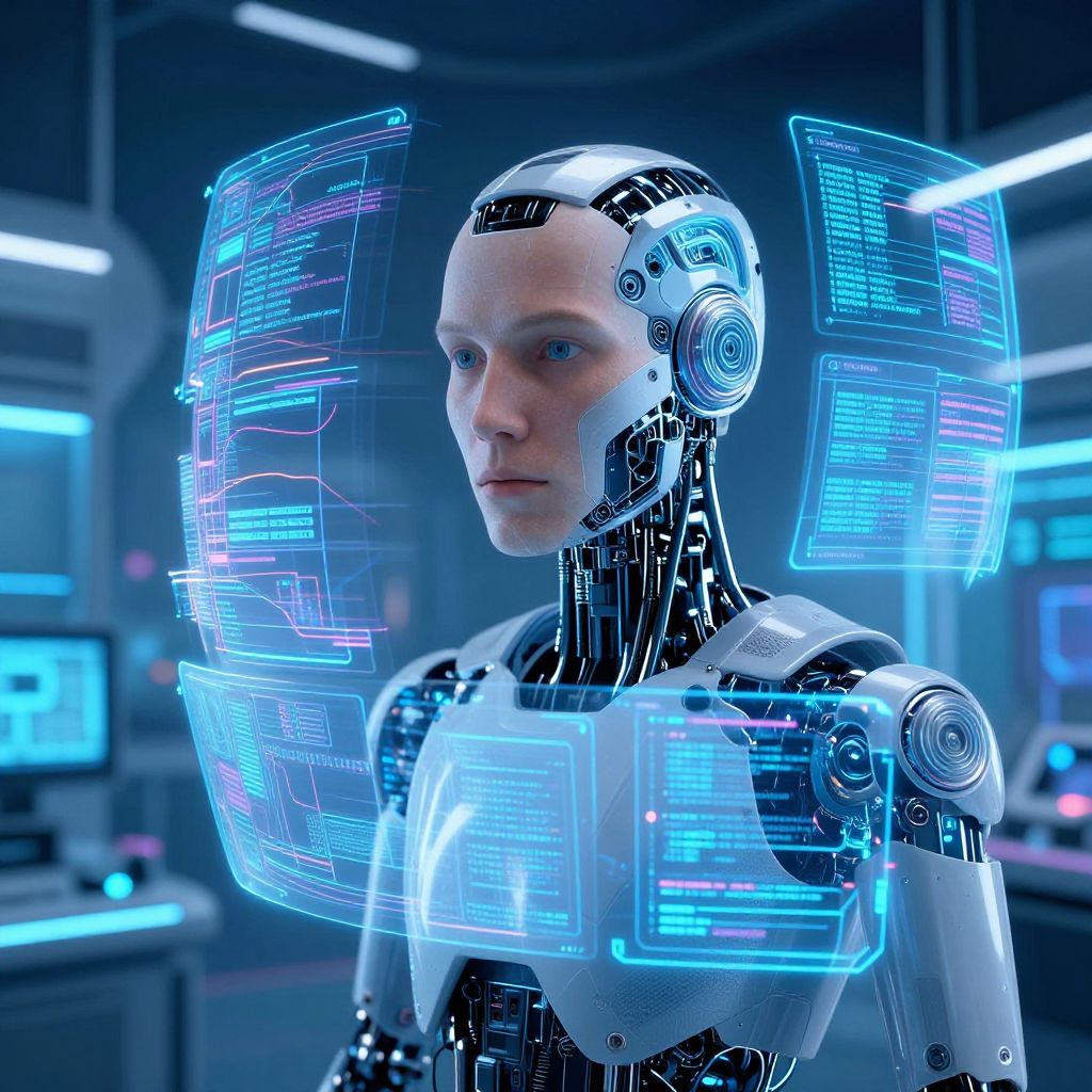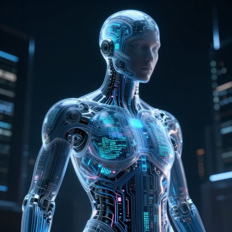 Augmentation depicted as a transformation sequence where a human figure gradually merges with digital and robotic elements, surrounded by floating holograms and neon grids, emphasizing the fusion of biology and technology in a vivid cybernetic style.