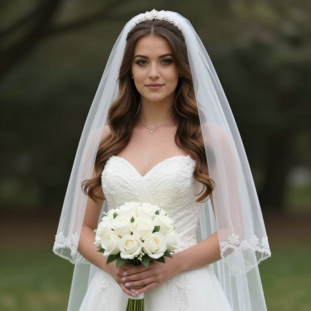 Wedding bride costume, 1girl, solo, dress, veil, brown hair, wedding dress, flower, bridal veil, realistic, bouquet, long hair, white dress, breasts, standing, cleavage
