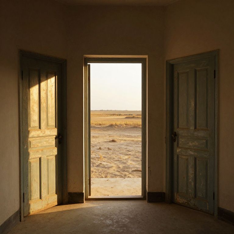 Sunlit doorways frame contrasting worlds, with three weathered entrances leading to varying scenes—two closed doors casting shadows indoors, while the third opens to a barren landscape bathed in golden sunlight.