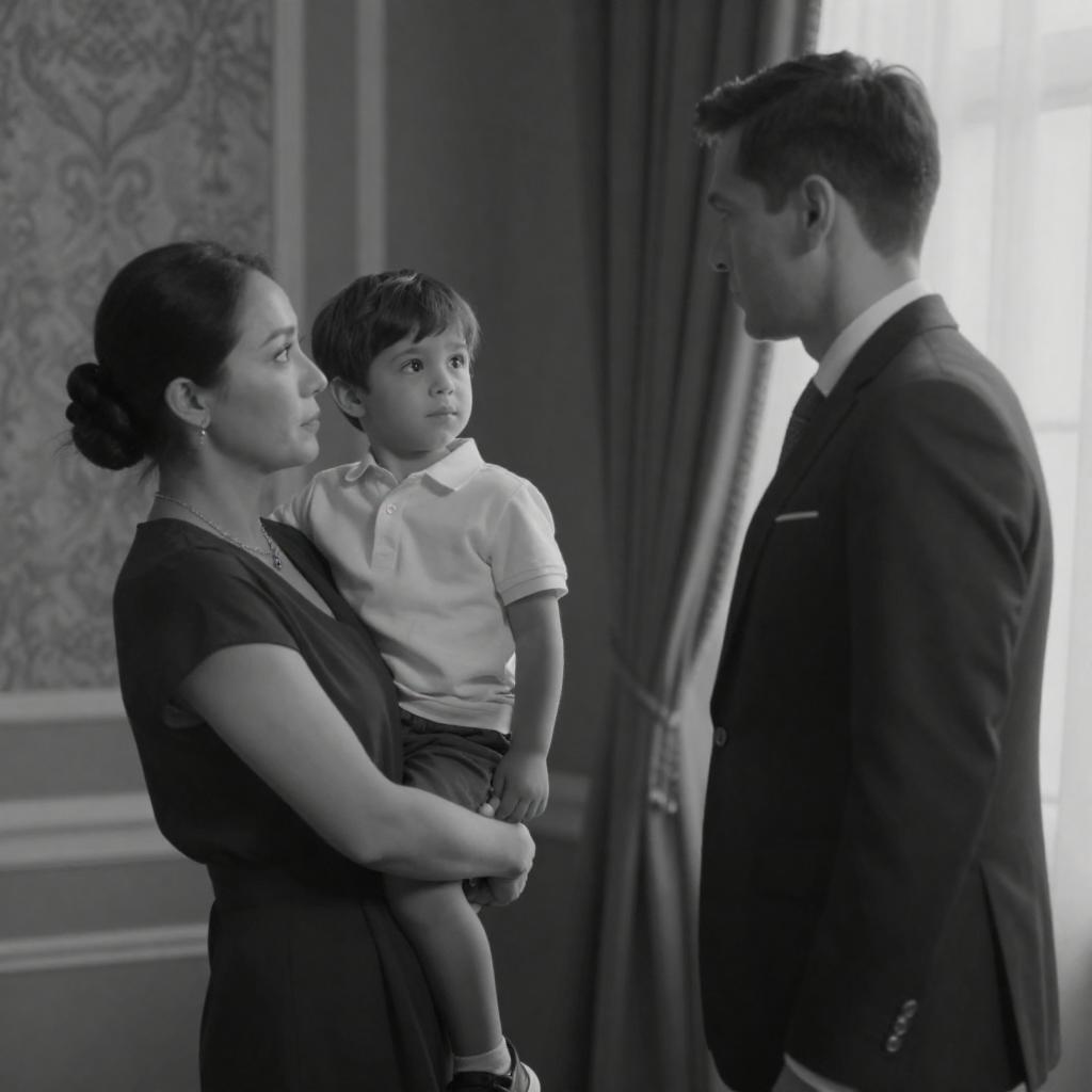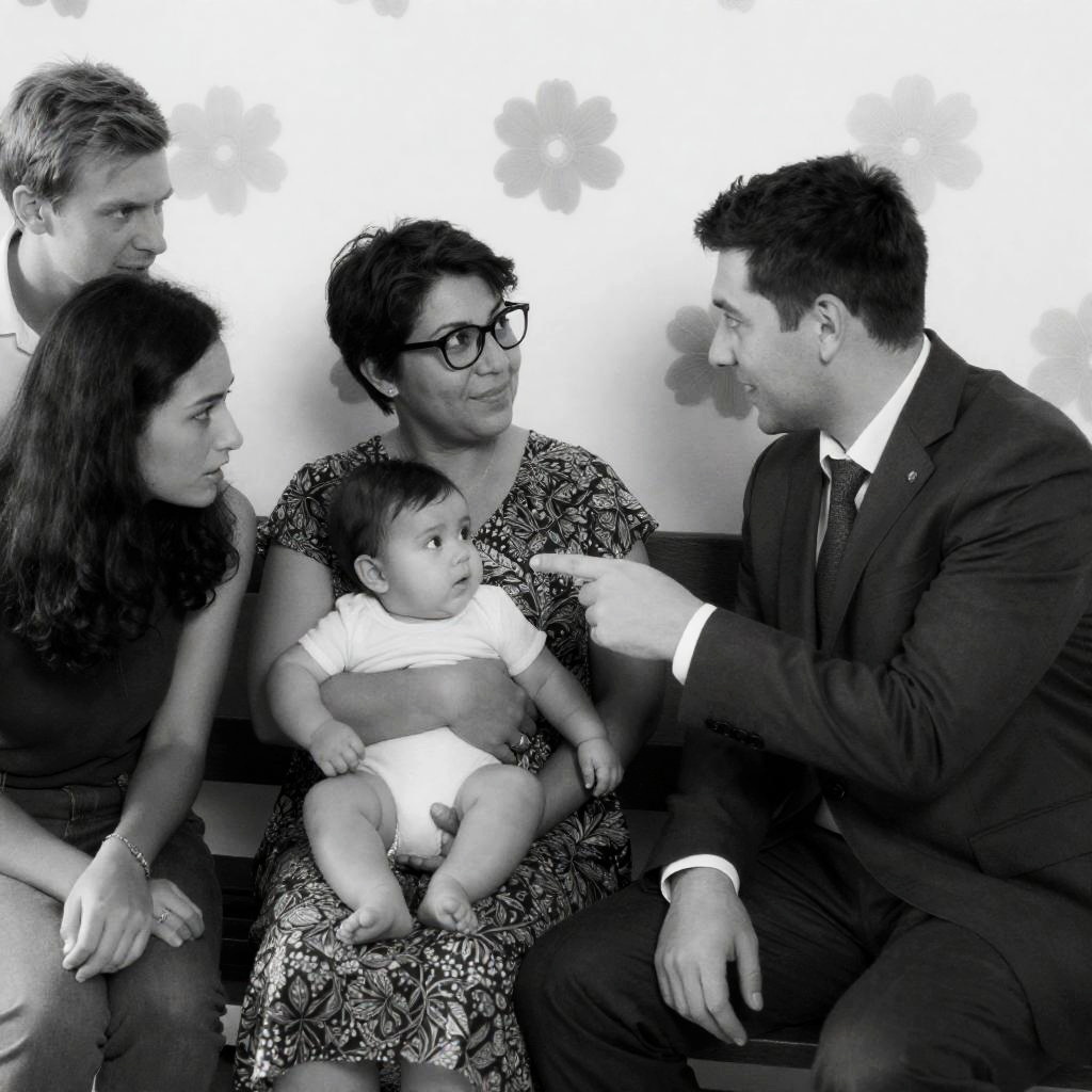Black-and-white photograph of a family scene. A man in a suit with short dark hair sits on a bench facing a woman in a patterned dress holding a baby. The woman has short hair and glasses. In the background, a floral-patterned wall. On the left, partial images of a man and woman with intense expressions. The man has short, light-colored hair. The woman has dark, wavy hair. The man in the suit points to the right.
